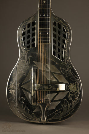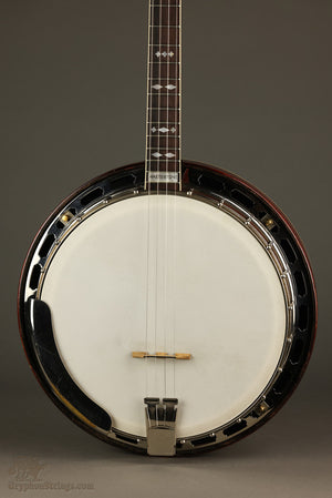 This Epiphone archtop has seen lots of playing time over the years but it has held up well and is ready for more. Original tuners and tuner buttons, plus the original pickguard (a rarity!). Frequensator tailpiece has been repaired at the hinge and seems solid. The adjustable bridge is well-fitted to the top but hard to be sure all the bridge parts are original. Finish appears original, note that the celluloid binding has come loose in some spots and been reglued, typical binding shrinkage has resulted in some gaps. Note that the carved spruce top has some compression fractures at the outer edge of the lower bout (treble side), but the carved maple back has no cracks at all. There's lots of wear to the barrel of the neck but the neck finish, what's left of it, appears original. A sturdy American archtop from the era when jazz guitars ruled!